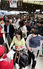 ゴールデンウイークが28日始まった。今年のカレンダーは、前半3連休(28~30日)と後半4連休(5月3~6日)に分かれているため、やや小ぶりな「大型連休」。海外よりも国内など、近場が人気を集めそうだ。初日の28日午前は各交通機関とも目立った大混雑やトラブルはなく、静かなスタートとなった。気になる天気は、気象庁の予想によると半ば(30日~5月1日)に一時崩れるという。【高倉友彰、江口一、三浦博之】 JR東海などによると、新幹線自由席の乗車率(午前10時半現在)は、東京発博多行きの始発「のぞみ1号」の110%が最高。この他に目立った混雑はない。東海道新幹線の予約も29日から5月2日までは空席があり、下りのピークは5月3日と予想している。 日本航空と全日空によると、羽田発の下り便は28日午前出発便の予約率が9割を超え、ほぼ満席状態が続いている。羽田空港は27日から利用客が増え始め、28日も朝からロビーなどがやや混雑している。 日本道路交通情報センターによると、28日午前9時現在、東名高速下り大和トンネル付近で11キロの渋滞が発生。しかし、レジャーの分散化がすすんでいるためか、事前の予測ほどには混雑は目立っていない。東、中、西日本の各高速道路会社は、利用のピークは下りが5月3日、上りが5月4~5日と予測している。 成田国際空港は海外に出かける家族連れやカップルなどで混雑のピークを迎えた。同日だけで約5万300人が出発、出国ロビーは、朝から大きな荷物を持つ人たちであふれた。 27日から5月6日までの同空港の出入国者数は前年比約1.5%増の約72万6600人に達すると予想され、過去最高になる見通し。中国をはじめアジアなど近場が人気だという。台湾に家族旅行に行く東京都多摩市、無職、荒川美智子さん(53)は「台湾は初めて、食べ物がおいしいと聞いているので楽しみ」と笑顔でチェックイン手続きをしていた。