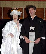 女優、寺島しのぶ(34)と仏人アートディレクター、ローラン・グナシア氏(39)が26日、東京・永田町の日枝神社で挙式した。式終了後、同神社で会見した寺島は白むく、ローラン氏は「呂」を“家紋”にした紋付きはかま姿で登場。寺島は「神聖な気持ちになりました」、ローラン氏は「しのぶの今日の姿を見て泣いてしまった」などと喜びを語った。 日枝神社の社殿で挙式後、会見した2人は何度も熱々で見つめ合った。
